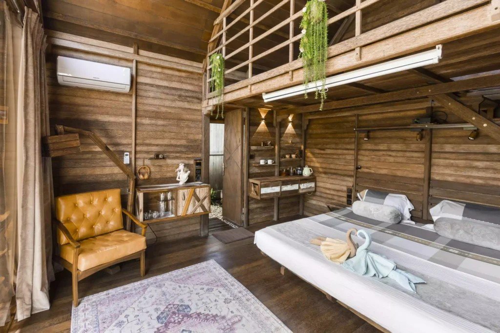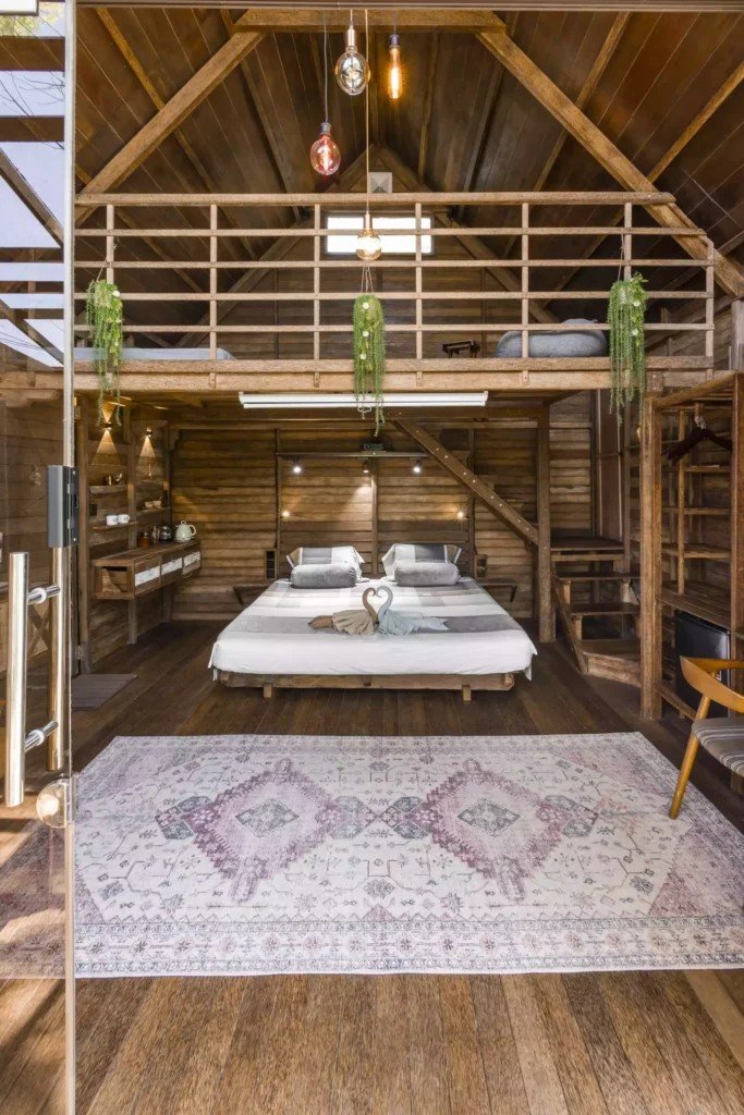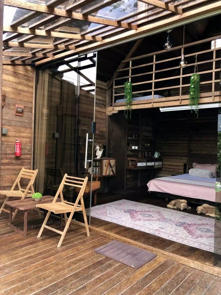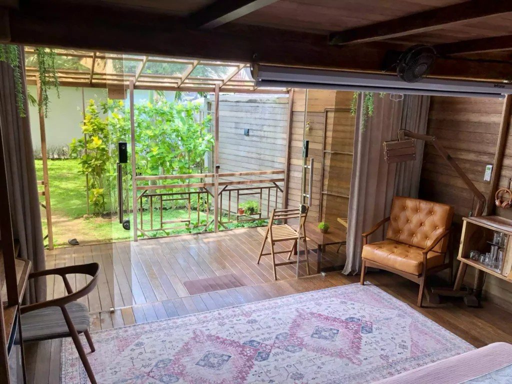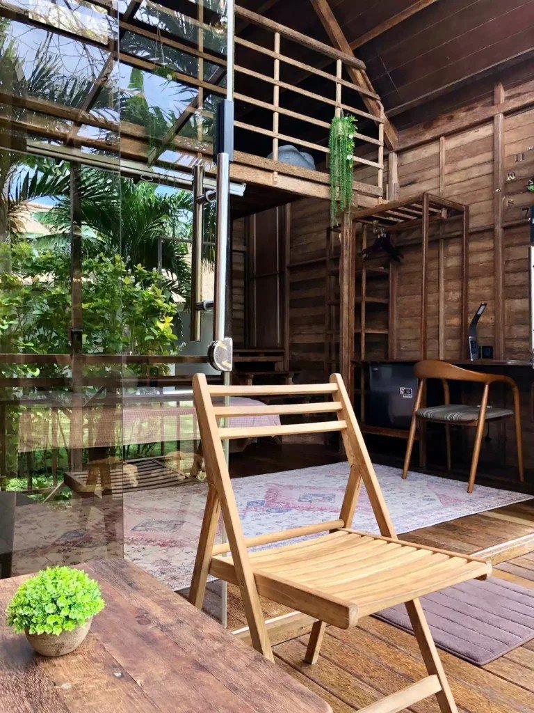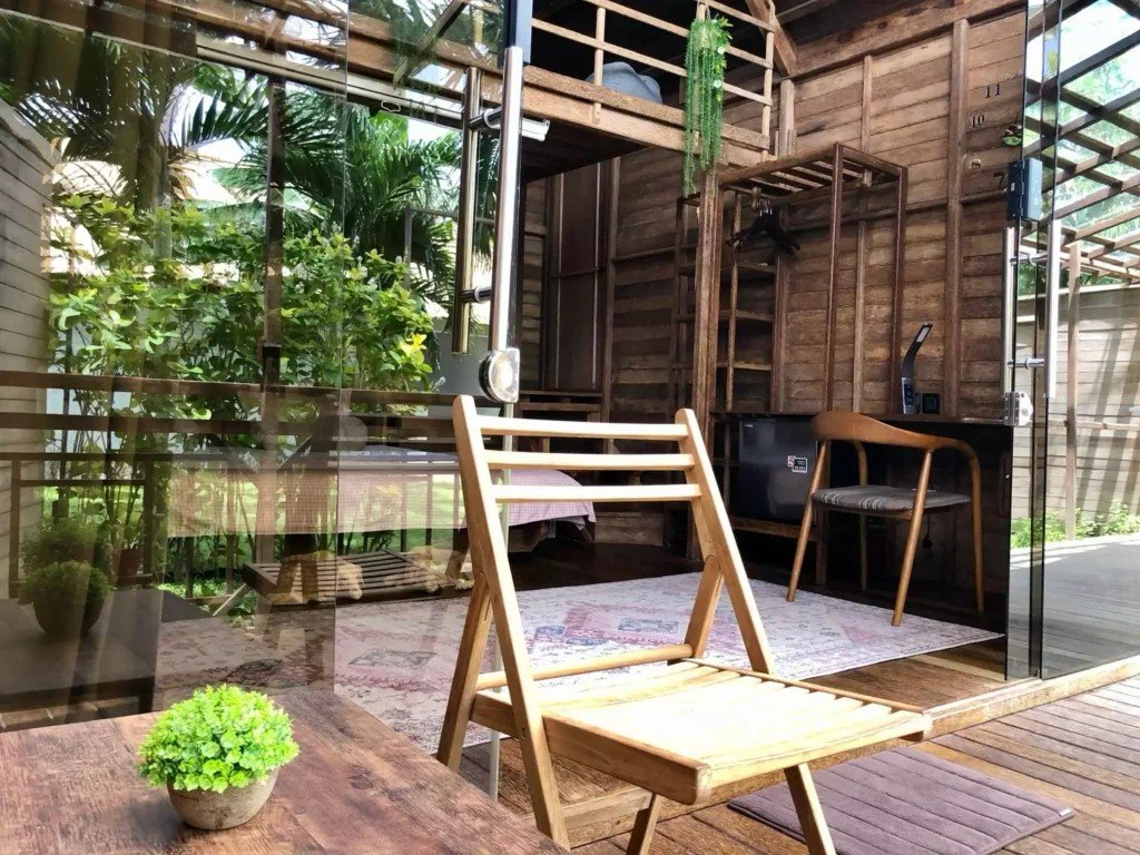 Второто ниво включва емпоре с подов матрак, проектиран изключително за деца. Самостоятелната баня е красиво заобиколена от растения, създаващи естествена атмосфера. Излезте навън на терасата със стъклен покрив, маса и два стола, предлагаща спокойно място за релакс. Бунгалото разполага и със самостоятелна градина, отделена от основния двор с растения, осигуряващи допълнителна поверителност.
