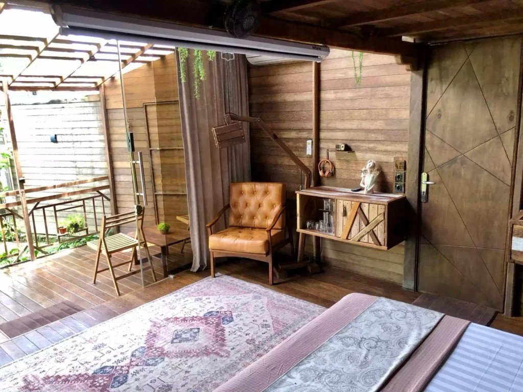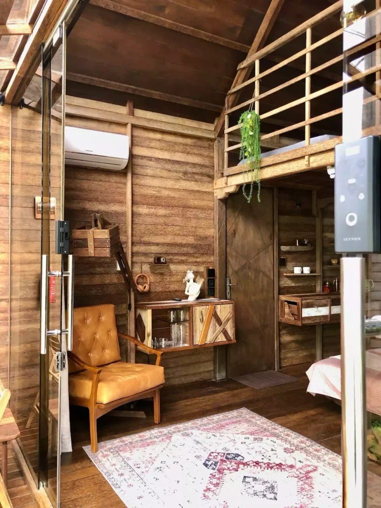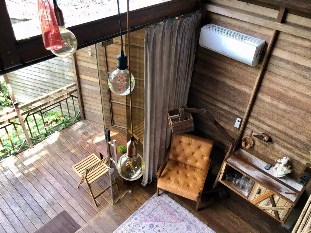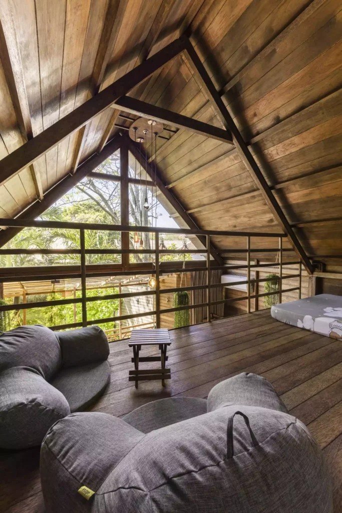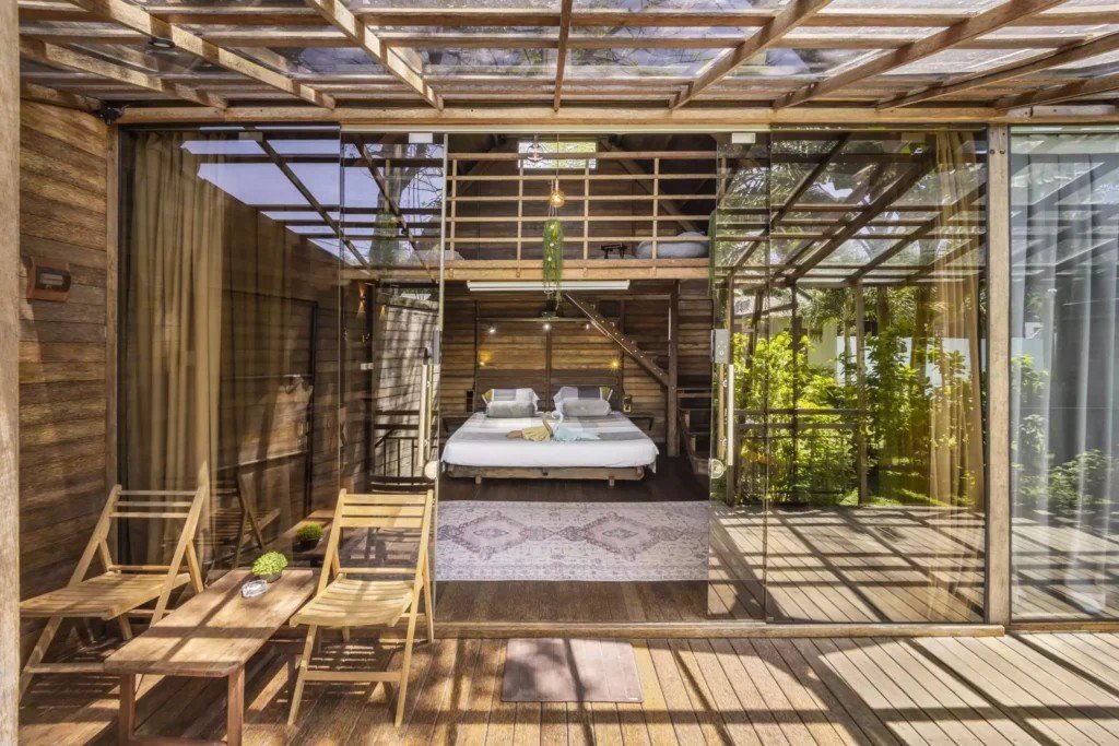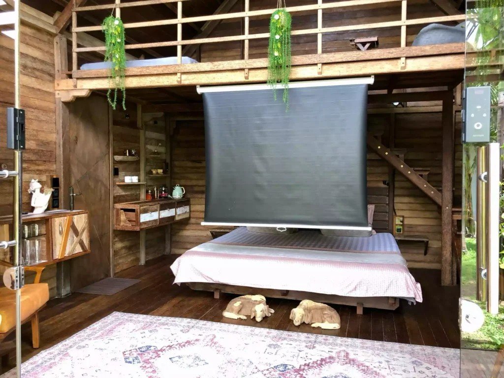 Второто ниво включва емпоре с подов матрак, проектиран изключително за деца. Самостоятелната баня е красиво заобиколена от растения, създаващи естествена атмосфера. Излезте навън на терасата със стъклен покрив, маса и два стола, предлагаща спокойно място за релакс. Бунгалото разполага и със самостоятелна градина, отделена от основния двор с растения, осигуряващи допълнителна поверителност.