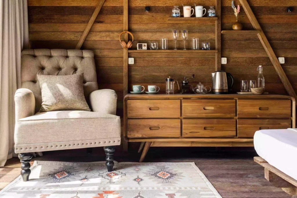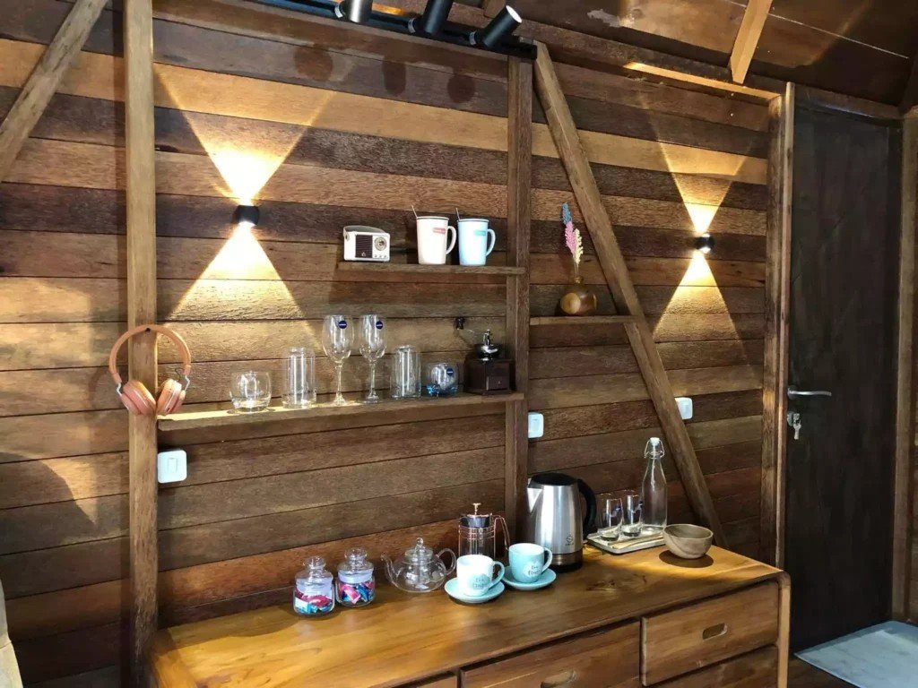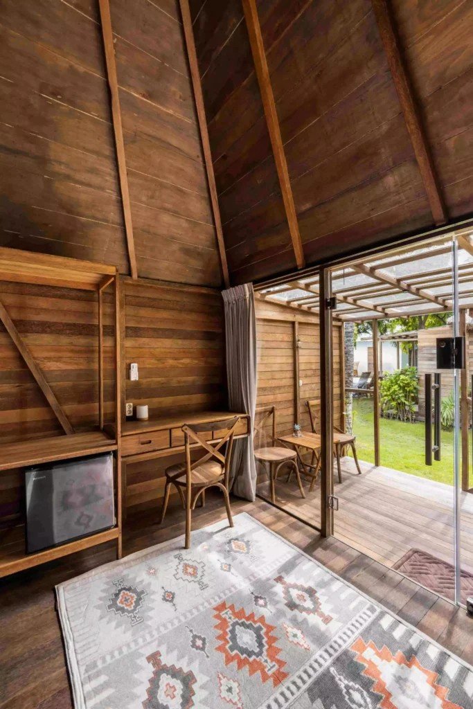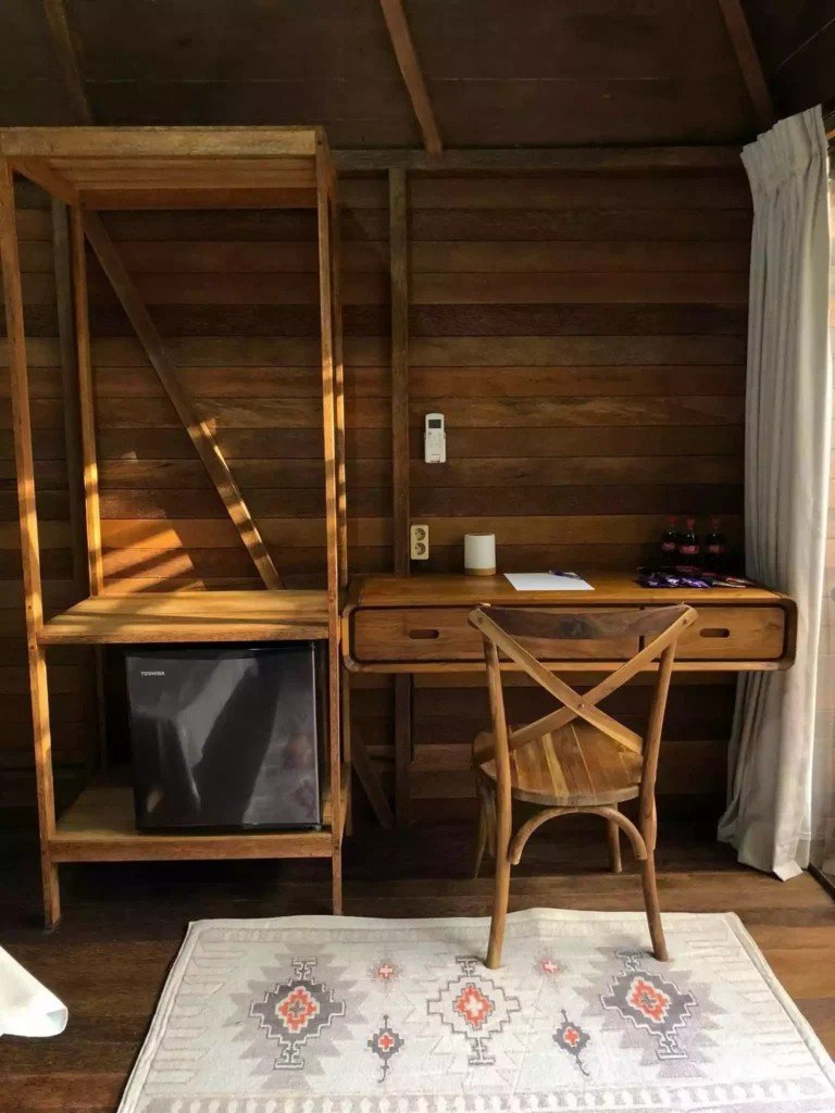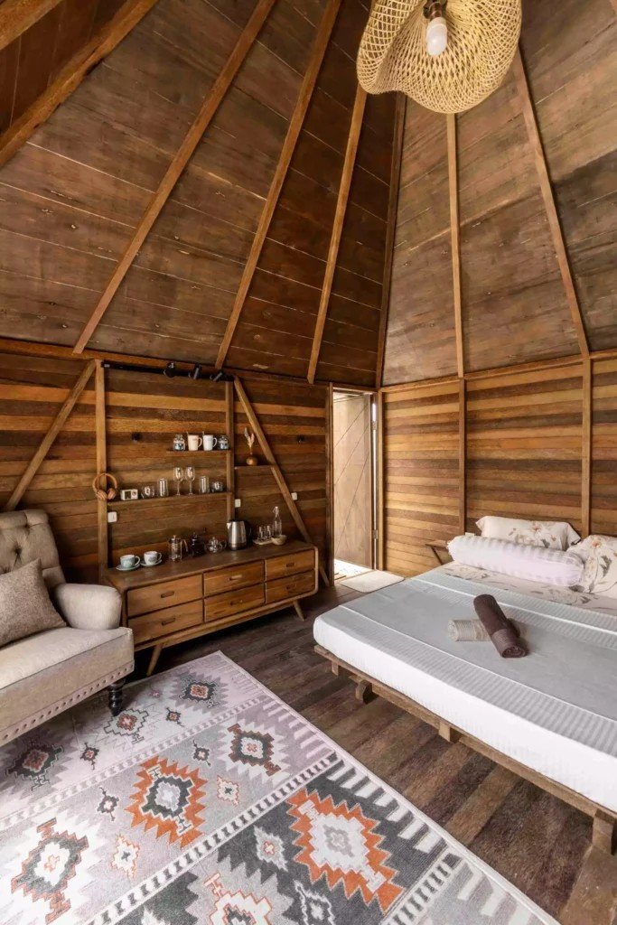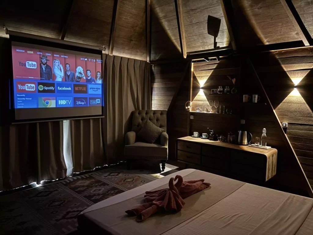 Вътре ще се насладите на просторна стая с легло 1,60 м х 2 м, работен кът и зона за релакс с фотьойл. Удобствата включват проектор, самостоятелна баня с палма, тераса със стъклен покрив, високоскоростен Wi-Fi и бутикови ръчно изработени мебели. Гостите имат достъп до споделени басейни, напълно оборудвана кухня и закуска (по избор).